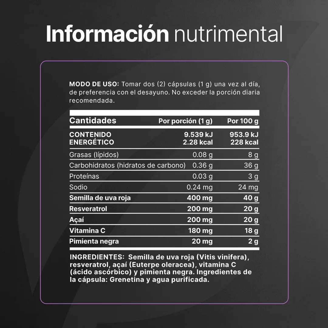 Descubre la formulación de Resveratrol B Life®, con 500 mg por cápsula que integran resveratrol, semillas de uva roja, açaí y vitamina C.